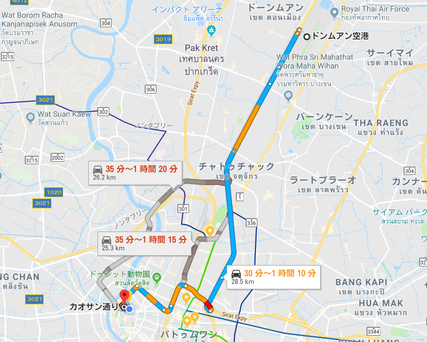 今回はドンムアン空港からこのカオサン通りに行く方法として、