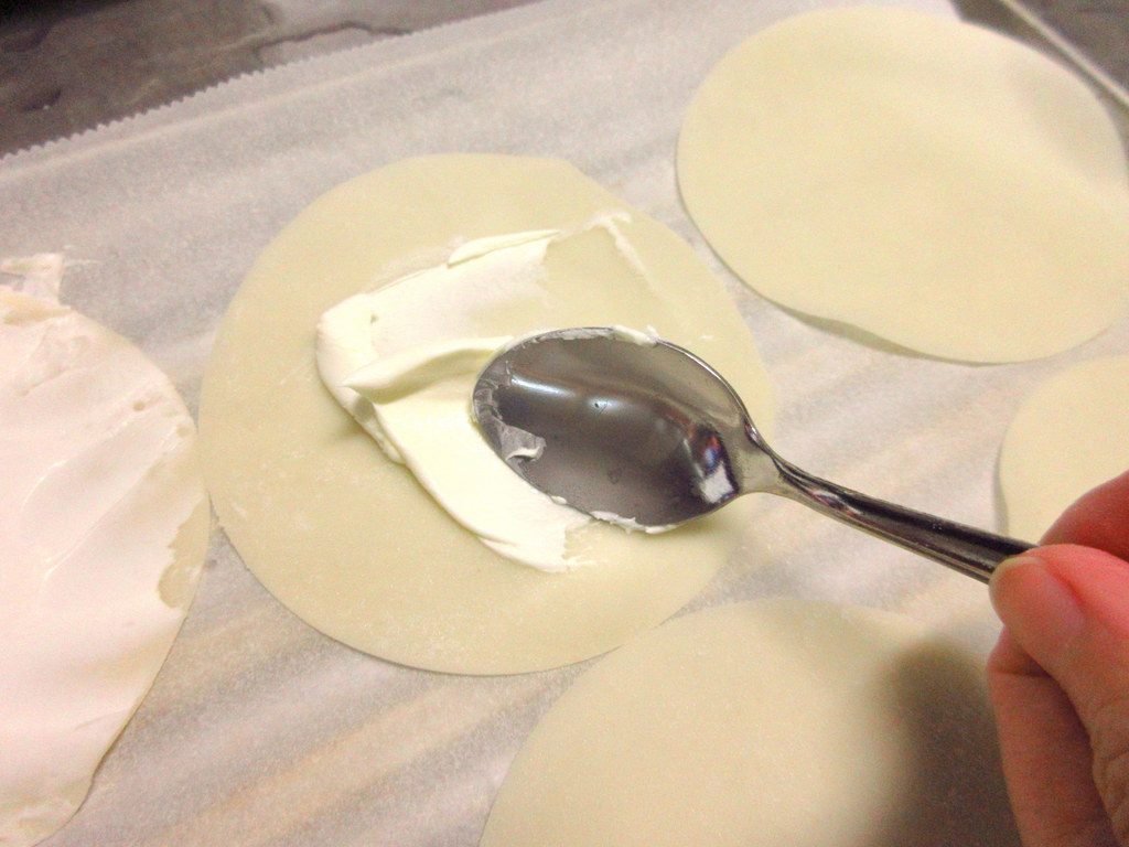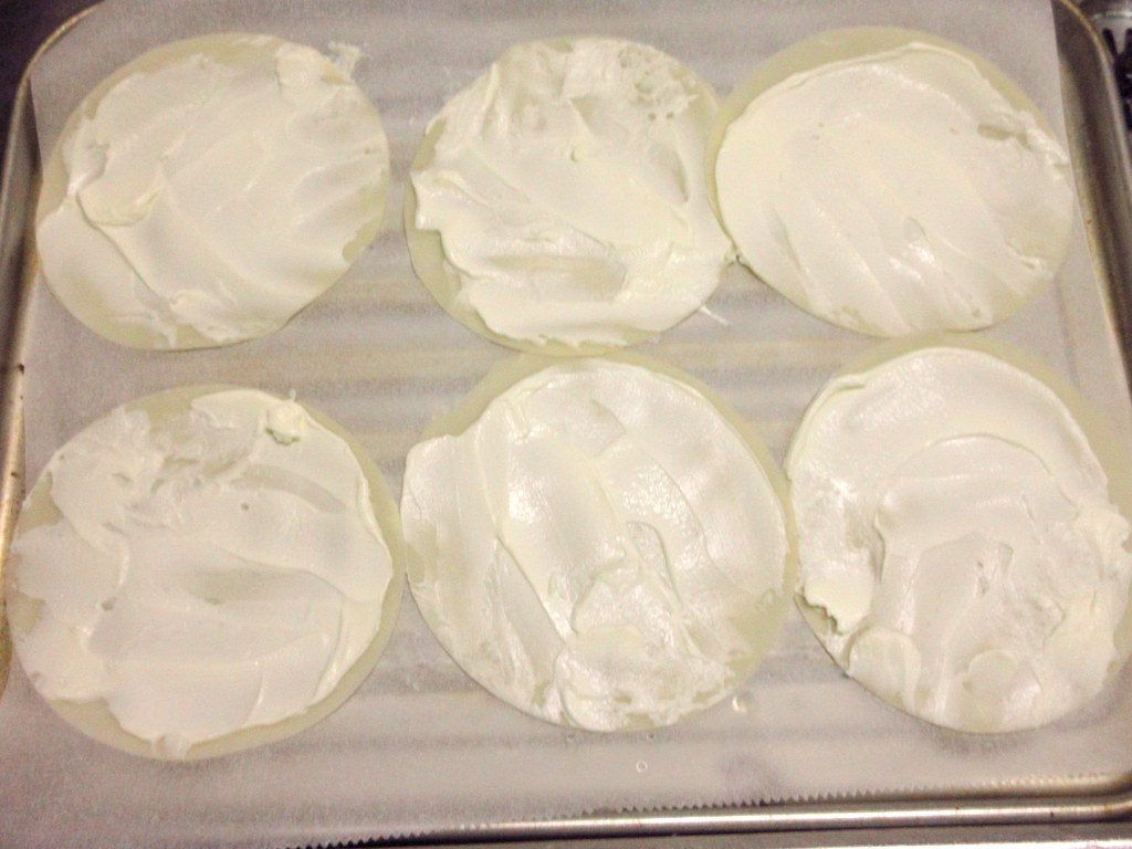 ここに、6~7gずつ、サワークリームをスプーンの裏で薄く塗っていきます。
