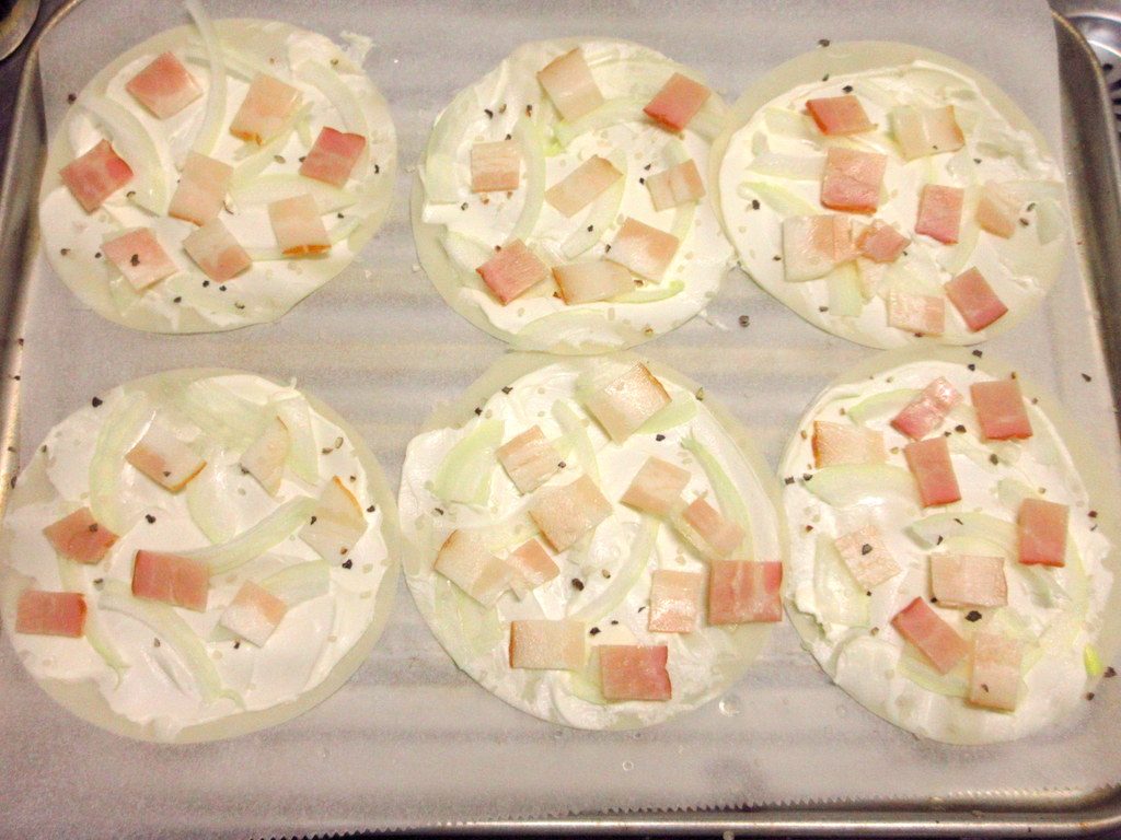 その上に、ベーコン・薄くスライスした玉ねぎをのせます。