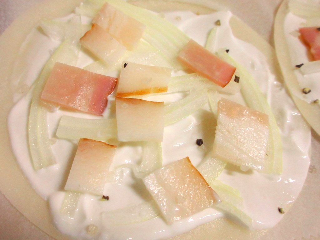 普通のピザはトマトソースを使いますが、フラムクーヘンは