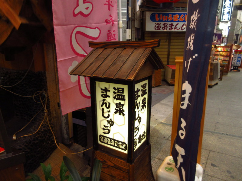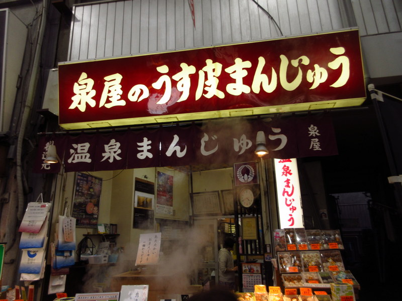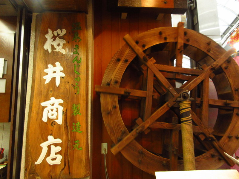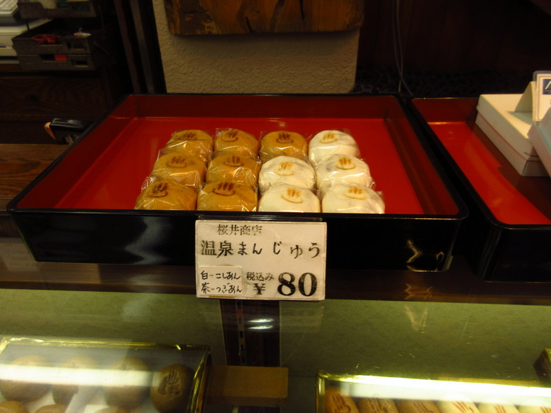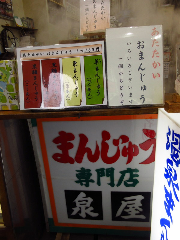 入って、さっそく温泉まんじゅうの看板を発見です!