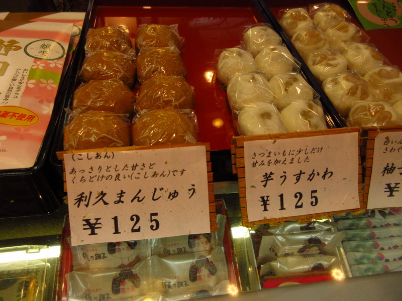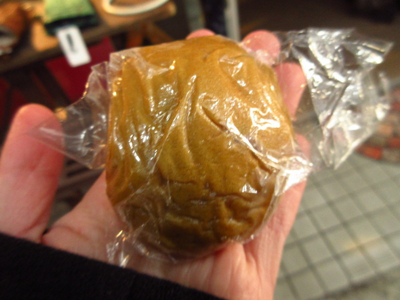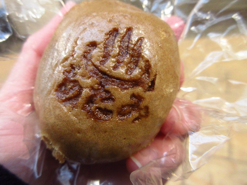 店頭に並んでいた、こちらの[su_highlight background=”#faf146″]利久まんじゅう(125円)[/su_highlight]をゲット。