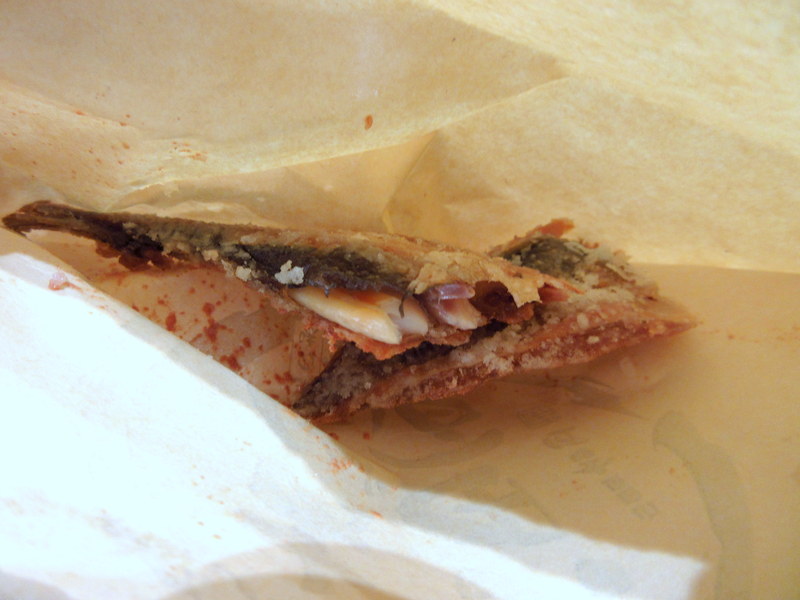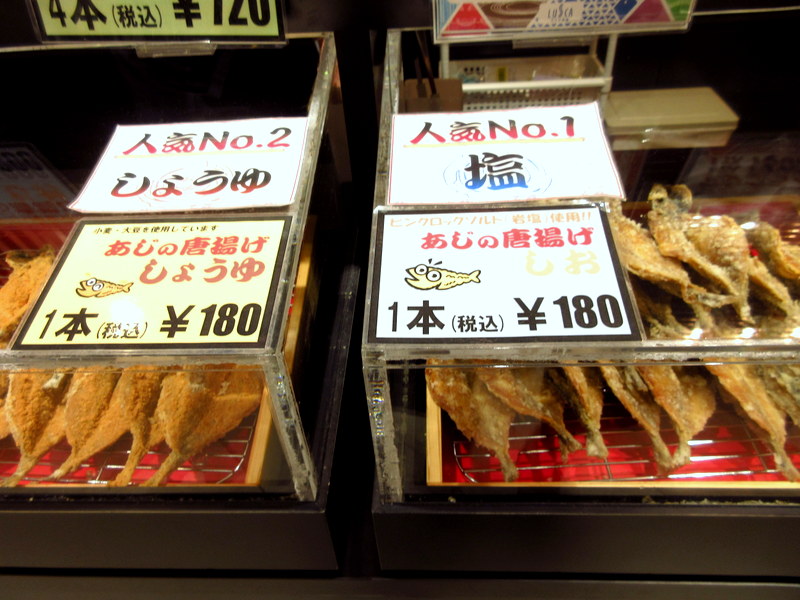 鯵の唐揚げは、醤油味を試食。駄菓子みたいな味でした。