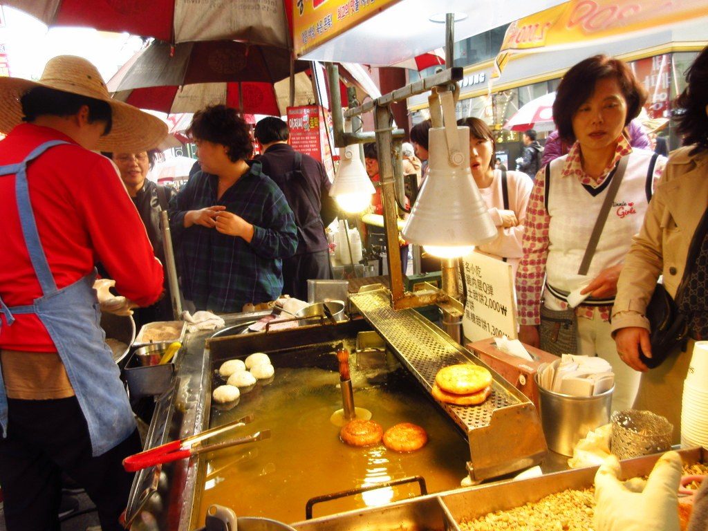 広場の中心には3店舗ほどのホットク屋台があり、