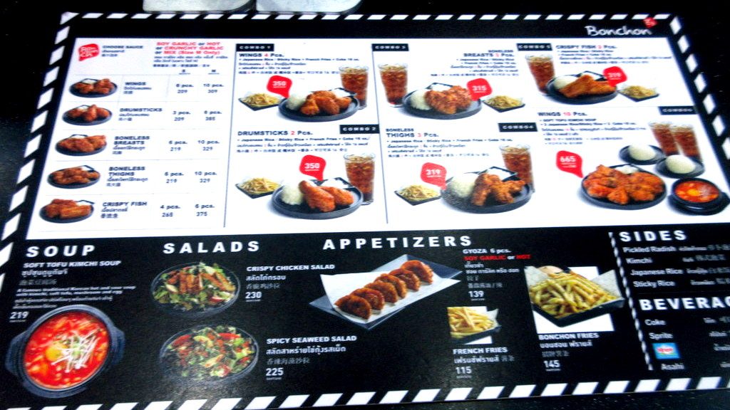 Bonchon Chickenのサイアム店のメニューはこちらです。(またぼやけてる・・・)