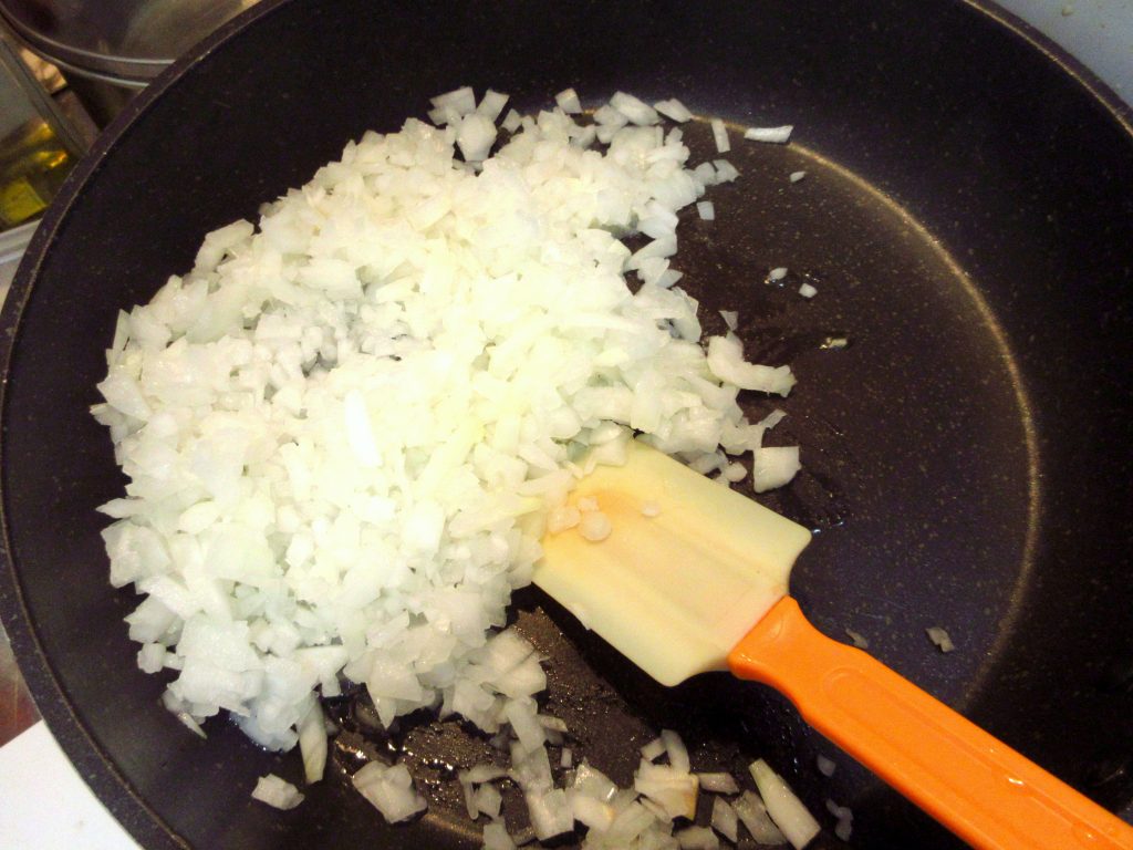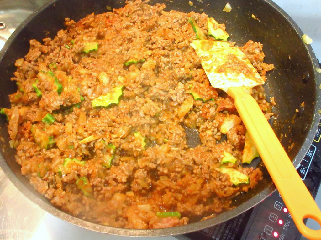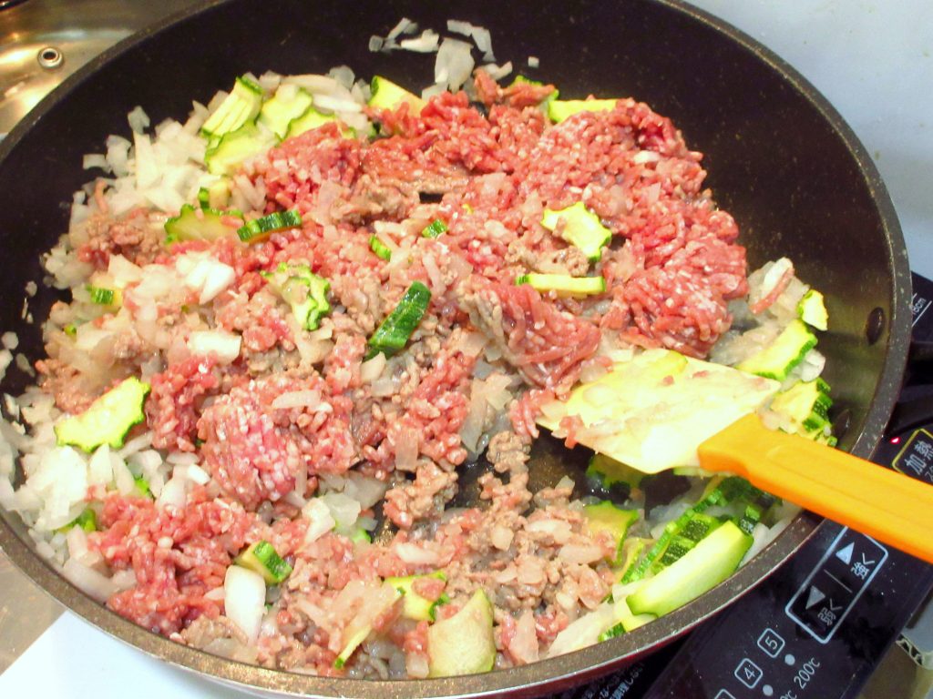 ①フライパンに油を熱し、玉ねぎ、ひき肉を炒めます。
