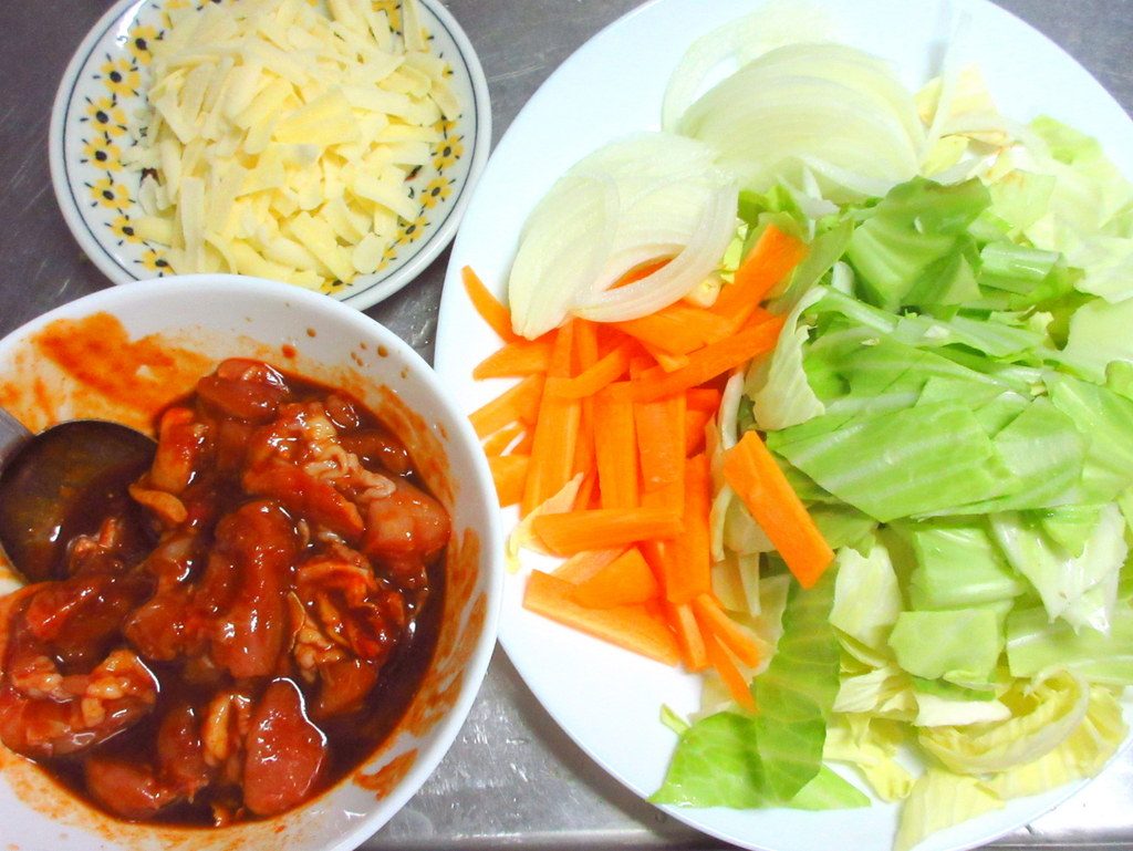 旨辛なコチュジャンソースの鶏肉に、チーズが絡み、とってもおいしいですよ~(^▽^)