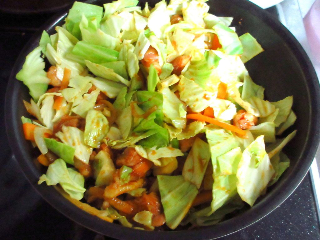 ②玉ねぎはスライス、人参は短冊切り、キャベツはざく切りにします。