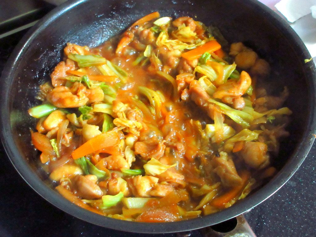 ③フライパン(小)にごま油をひき、野菜を炒め、鶏肉も入れます。