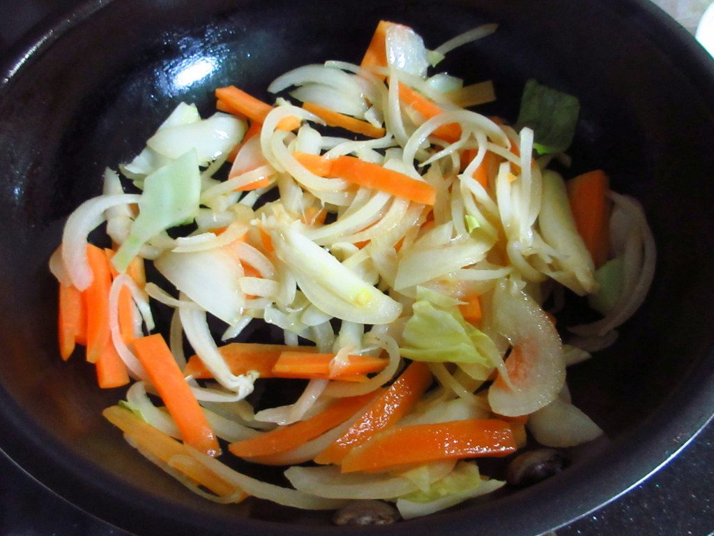 ②玉ねぎはスライス、人参は短冊切り、キャベツはざく切りにします。