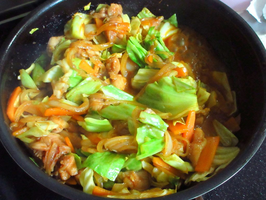 ③フライパン(小)にごま油をひき、野菜を炒め、鶏肉も入れます。