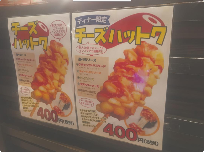 お値段は、チーズハットグ400円、ポテトチーズハットグ450円。