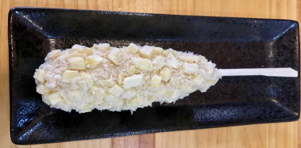 写真の通り、韓国の屋台の味を楽しめるチーズハットグです。