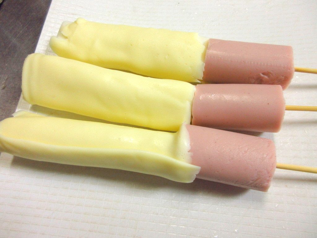 まず、魚肉ソーセージを3~4等分して竹串に刺し、さらにさけるチーズを串に刺します。