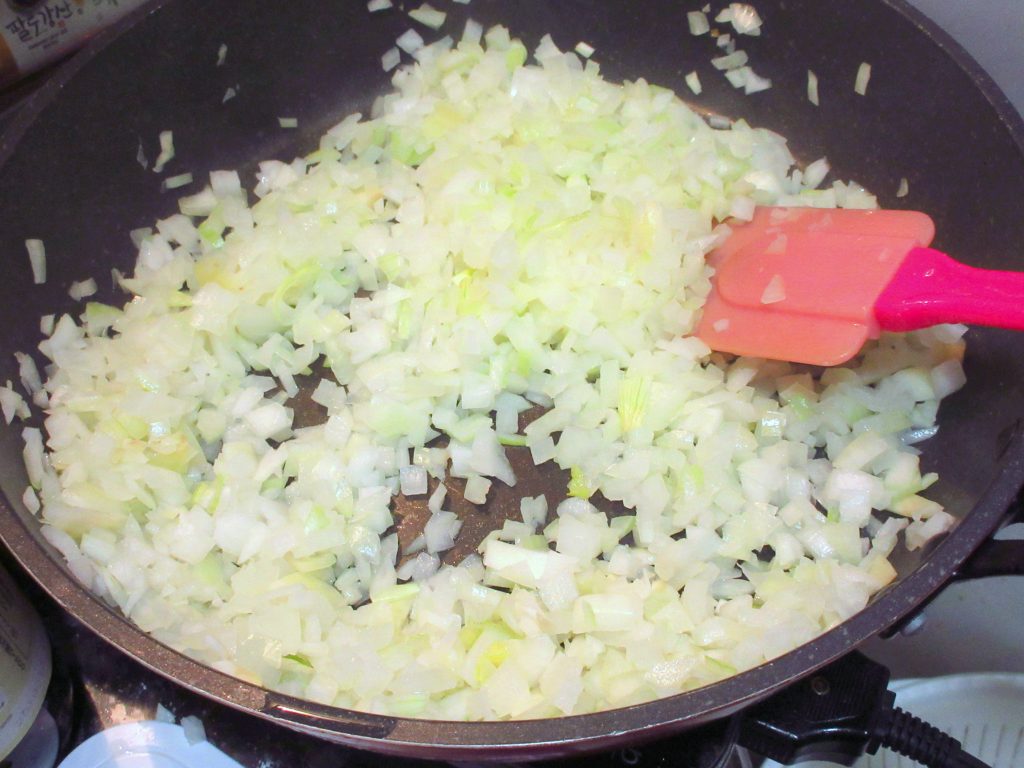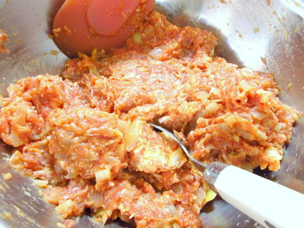 ②フライパンに油をしき、玉ねぎを炒めて冷まし、フィリングの材料全てを混ぜ合わせます。