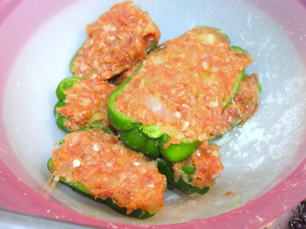 ピーマンに軽く小麦粉をはたいておくと、外れにくくなりますよ!