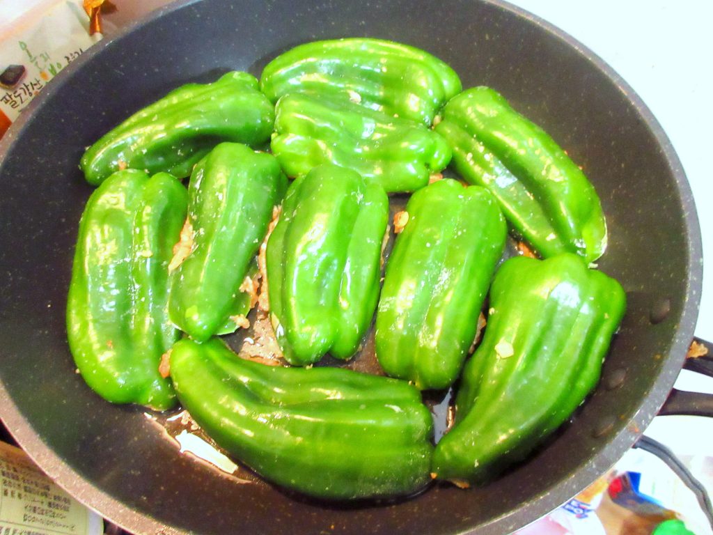 粘り気が出るまでよく混ぜたら、半分カットにしたピーマンに詰めていきます。