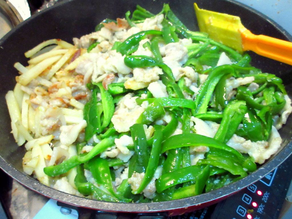 じゃがいもに火が通ったら、ピーマン を入れて、さっと炒めます。