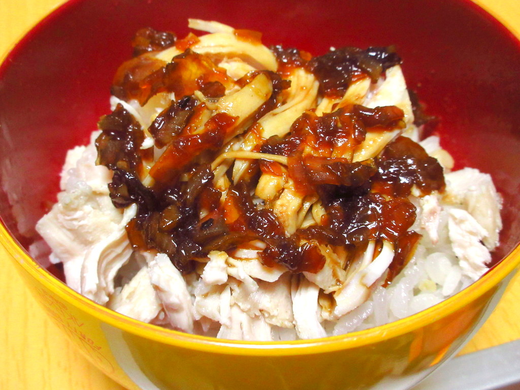 温かいご飯を茶碗によそい、切った鶏肉を乗せて上からタレをかけたら