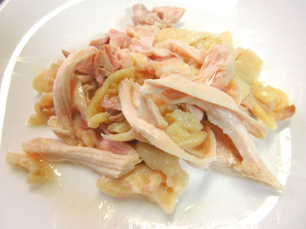 ①鶏肉はゆでて、裂くか包丁で刻んでおきます。