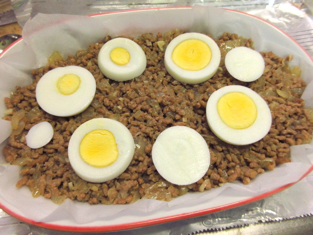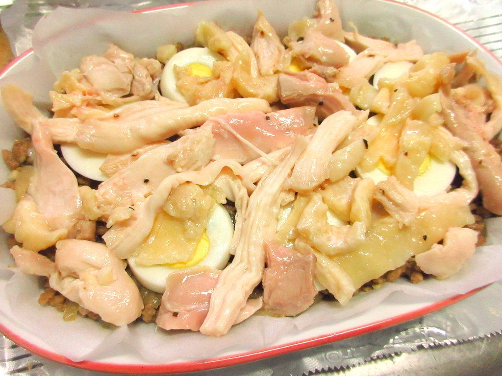 この料理は、ひき肉、ゆで卵、オリーブ、鶏むね肉の入ったグラタン。