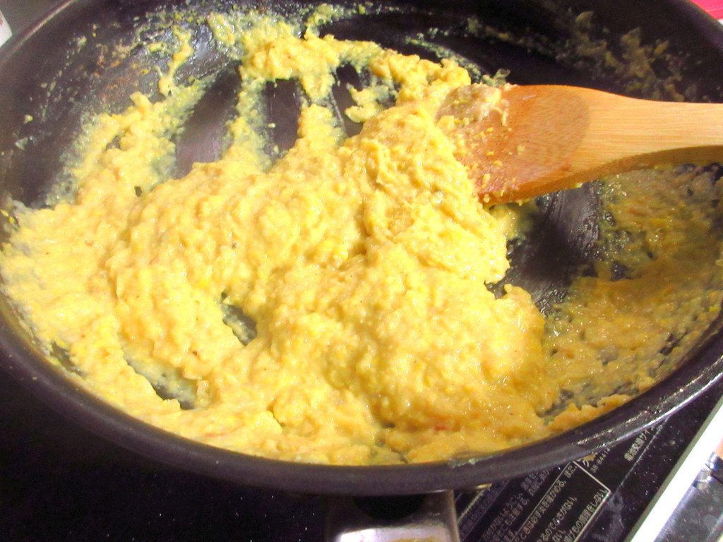 生のとうもろこしをすりおろし、煮詰めることででんぷんを糊化させて、