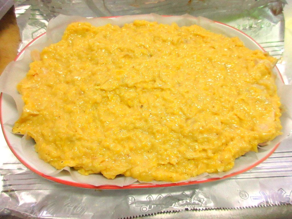 さらにここに、とうもろこしのソースをかけ、平らにならします。