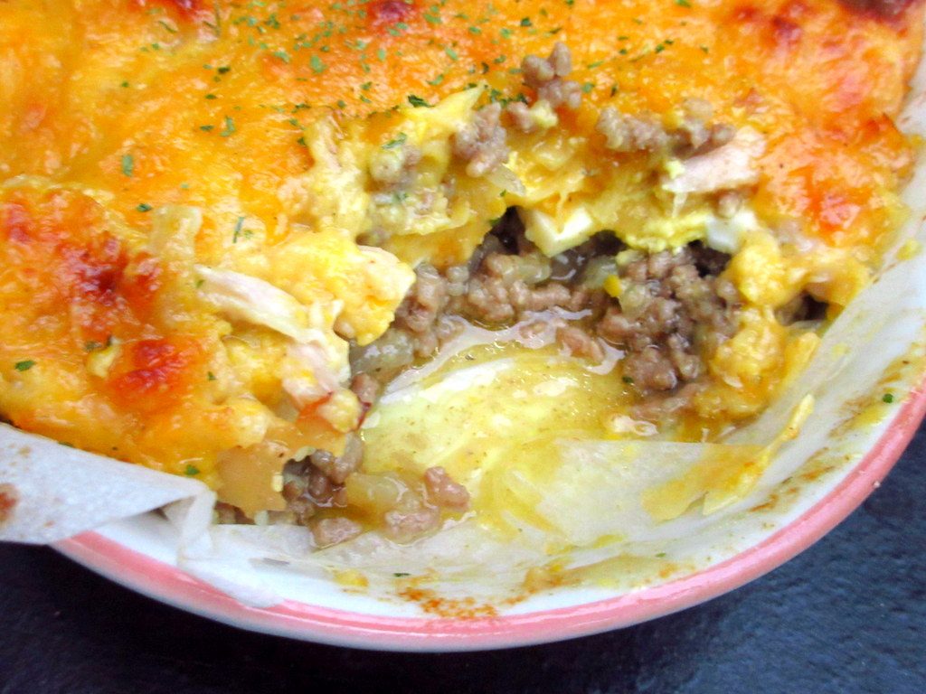 例えるなら、イギリスのシェパーズパイ(ひき肉の上にマッシュポテトを乗せたグラタン)の