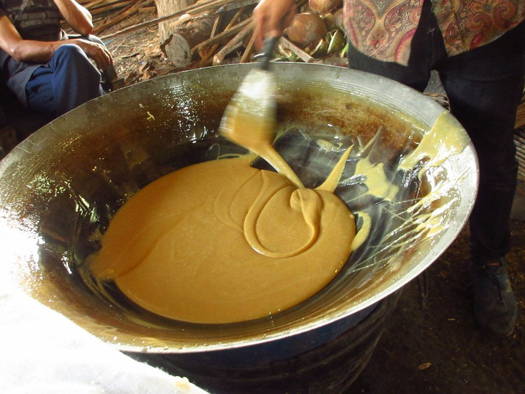 釜の中でグツグツと煮込まれているココナッツの花の蜜は、