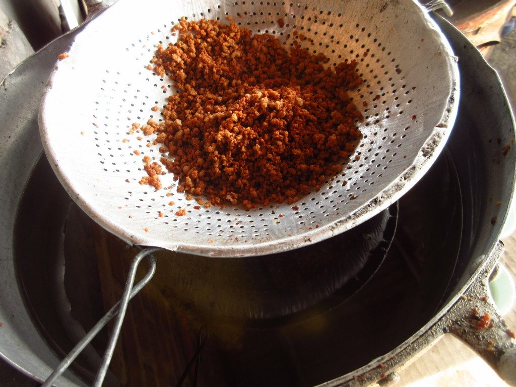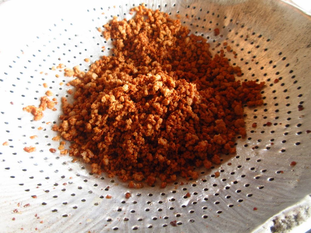 このツブツブは、オイルを煮詰めるときにできたココナッツのカスですが、