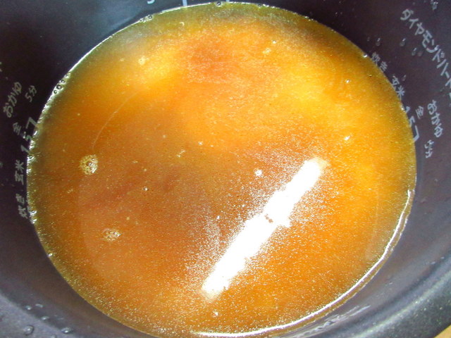 ⑤研いだお米と煮汁を炊飯器に入れ水加減を調整し、上に具材を入れスイッチを入れます。