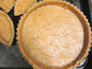フォークで穴を開けます(余りは、小さなタルトレットにしきました)