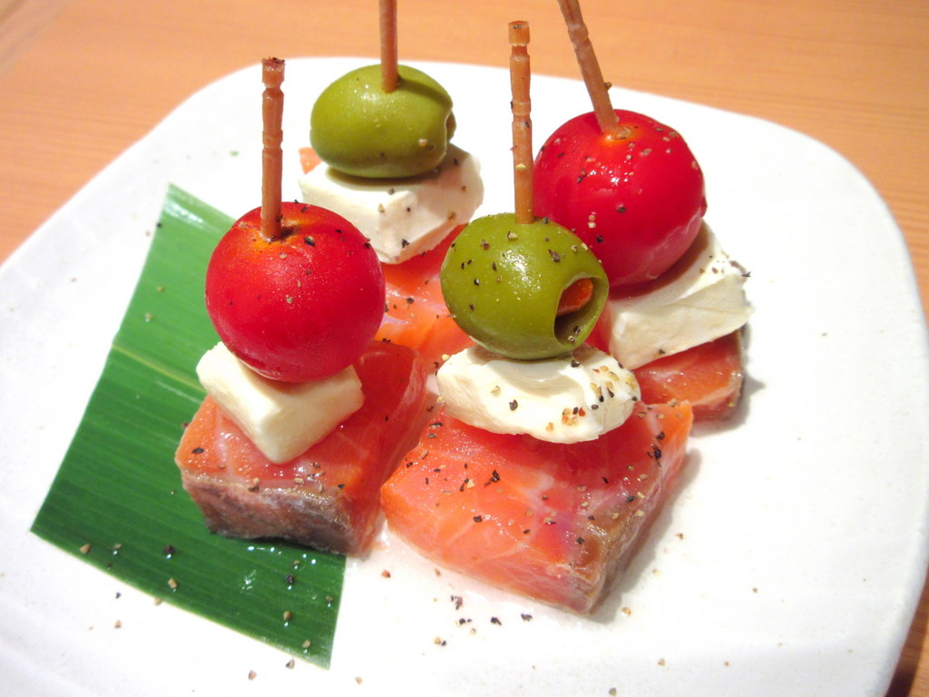 厚みのあるスモークサーモンの上にクリームチーズ、ミニトマトや