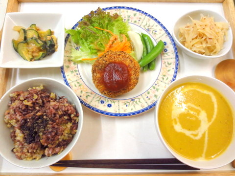 肉、魚、卵、乳製品、白砂糖不使用のランチです。