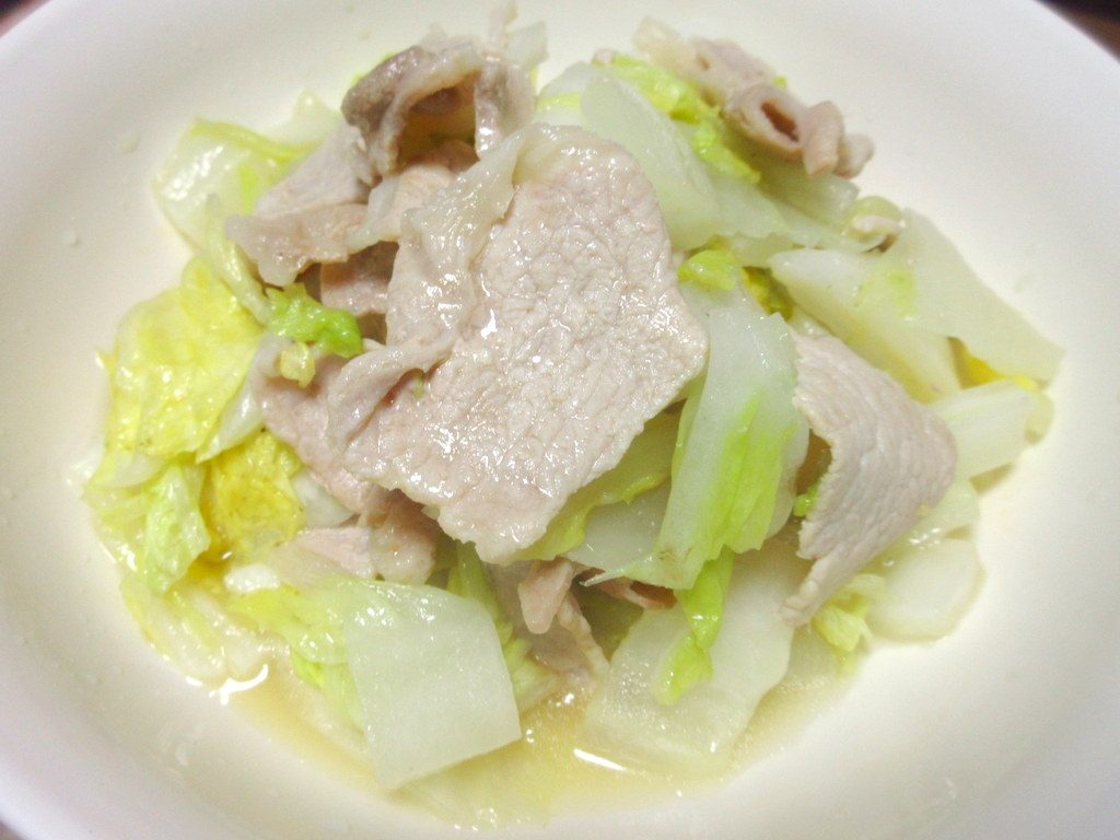 うまみこい豚という豚肉は白菜と一緒に塩とお酒で蒸し焼きにしました。