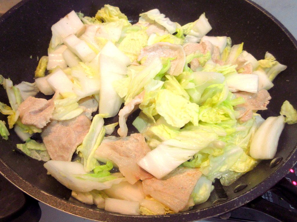 うまみこい豚という豚肉は白菜と一緒に塩とお酒で蒸し焼きにしました。