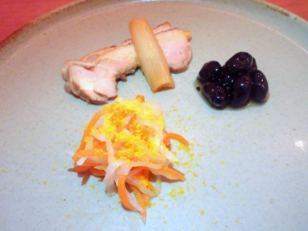 丹波黒豆のラム酒漬け、紅白なますにカラスミをトッピングしたものと鶏南蛮漬けでした。