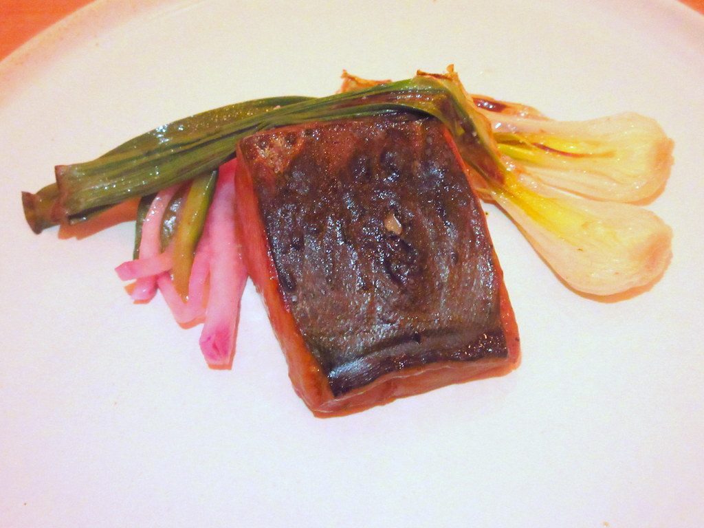 ローストされた付け合わせのネギが驚くほど甘くて美味しいです!