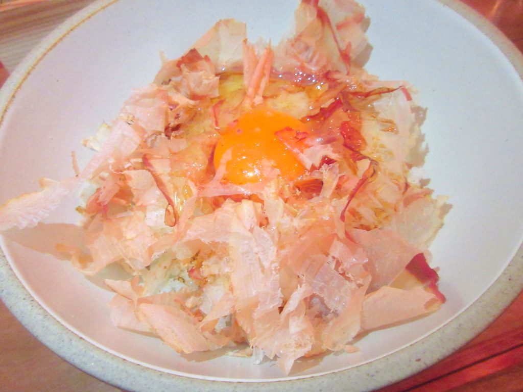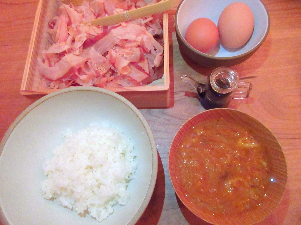 そして最後の締めは先ほど紹介した鰹節ご飯と生卵、お味噌汁です。