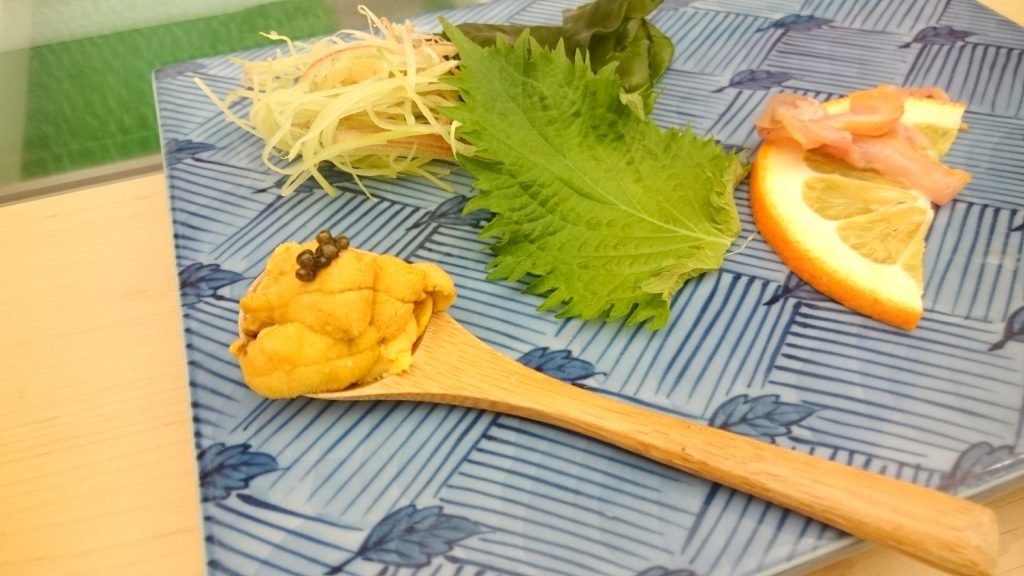 スプーンに盛られたウニ。一口で食べてびっくり。雑味がなくとろける食感と旨味!
