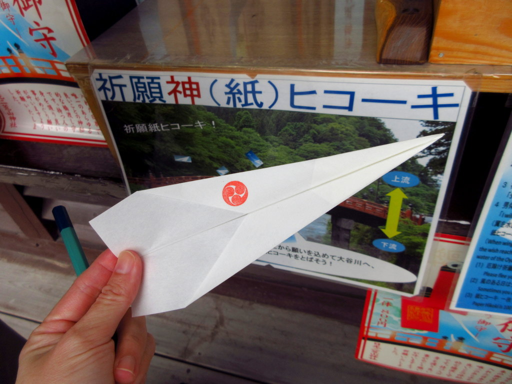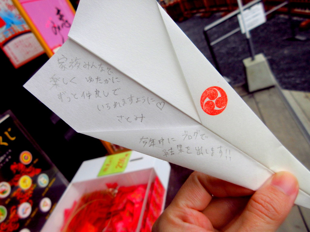 紙飛行機に鉛筆でお願いを記入して川上に向かって飛ばしました。