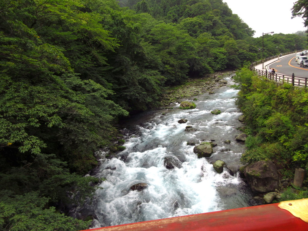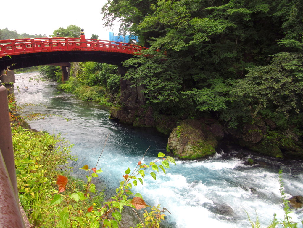 神橋は、深い緑色の森と、エメラルドグリーンの川に、