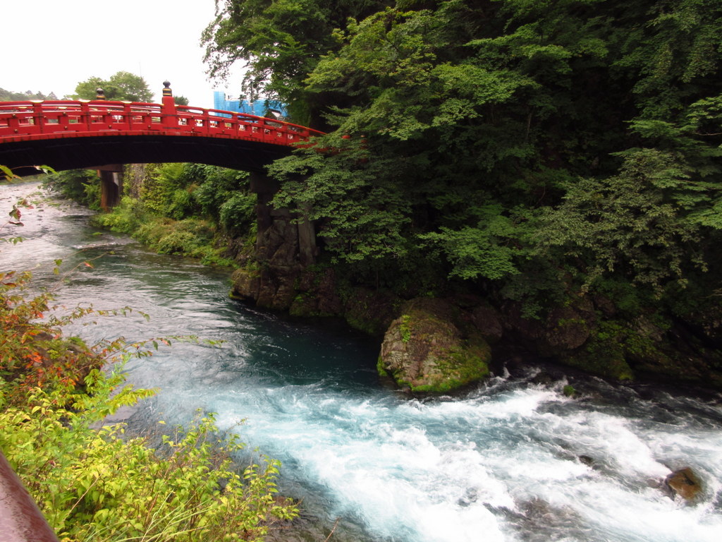 神橋は、深い緑色の森と、エメラルドグリーンの川に、