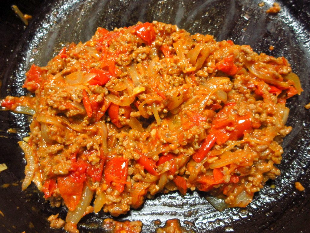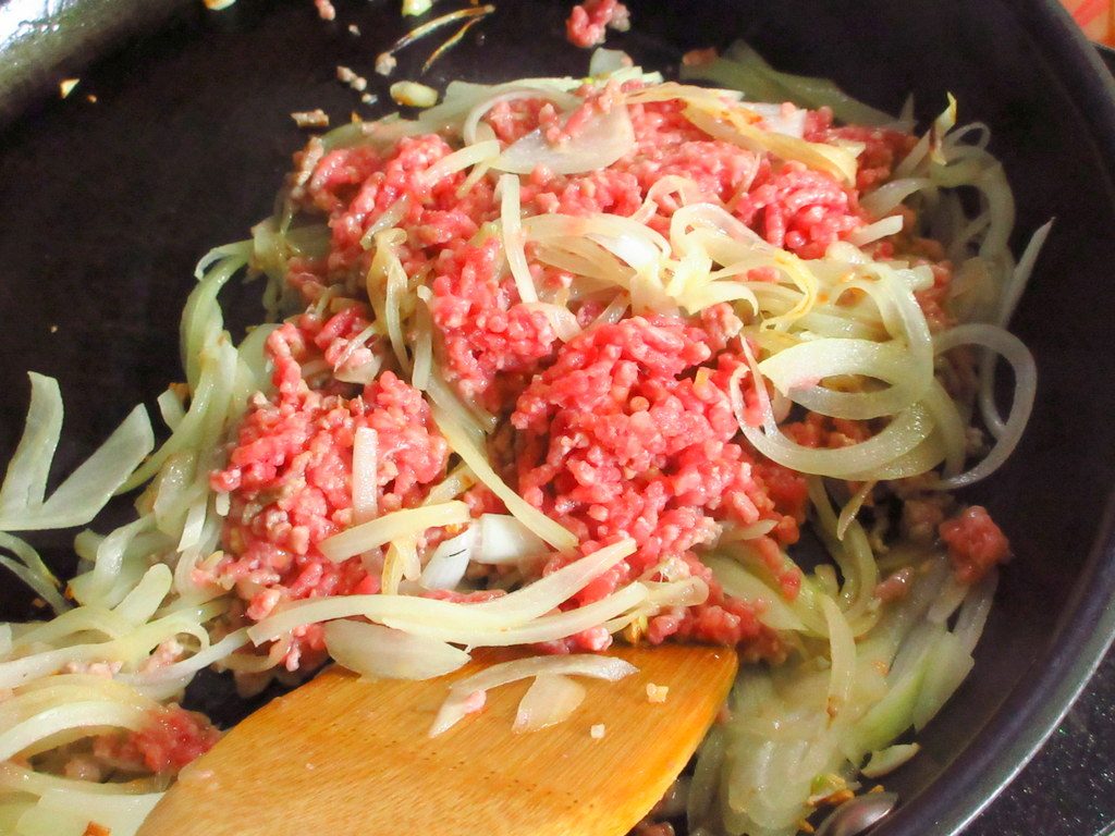 ②にんにく、たまねぎをみじん切りにし、油で炒めてひきにくを投入。