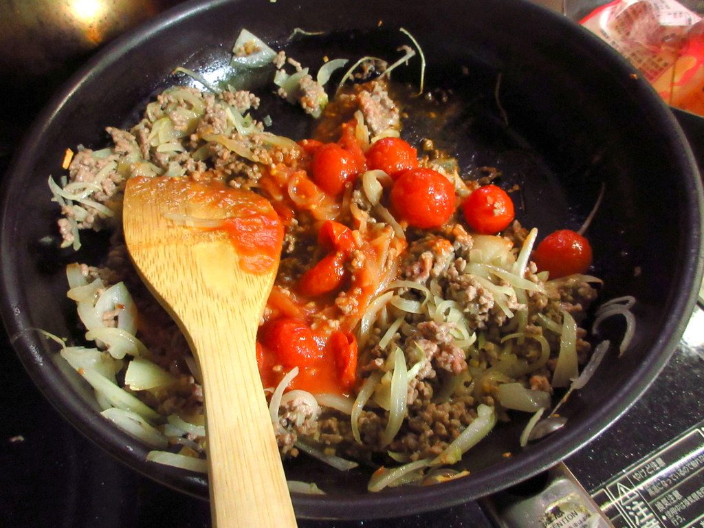 トマト缶も入れて、塩コショウ、コンソメで味をつけ、ミートソースにします。