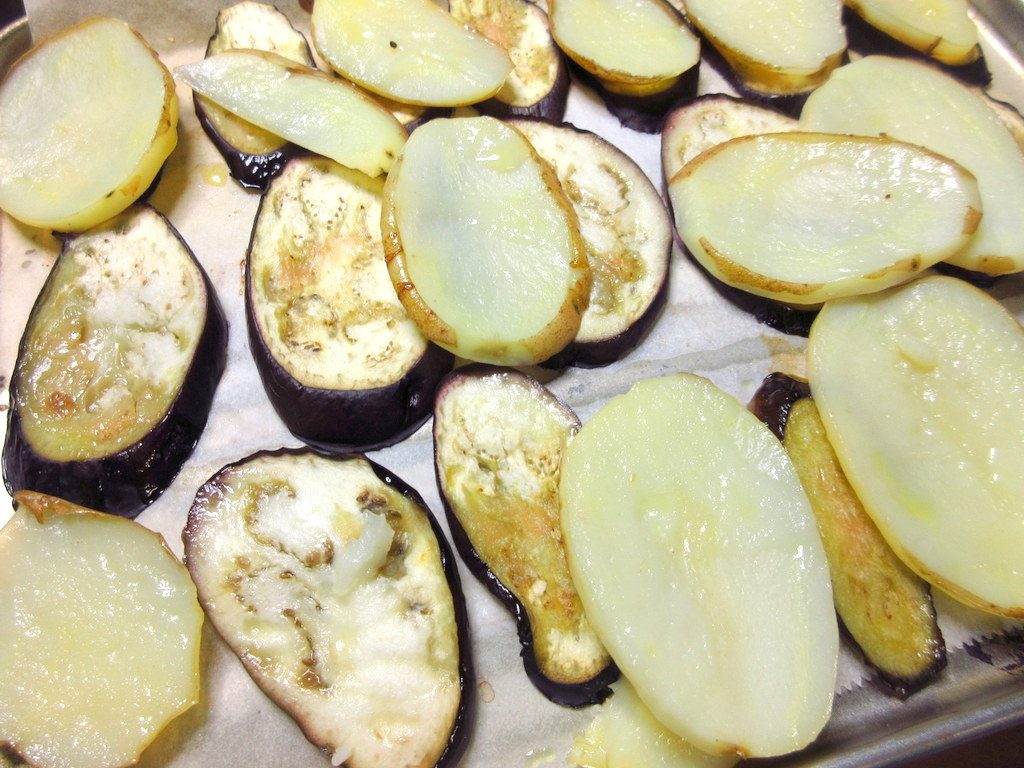 ①なす、じゃがいもはスライスしてトースターの天板にのせ、オリーブオイルをまわしかけて、トースターで火が通るまで加熱します。