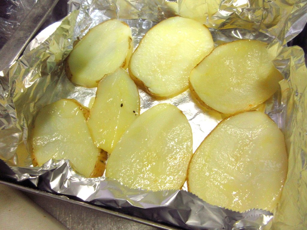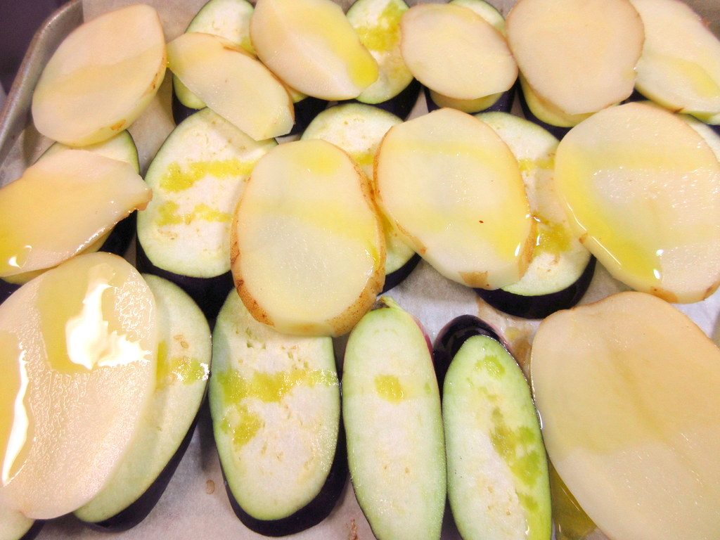 ①なす、じゃがいもはスライスしてトースターの天板にのせ、オリーブオイルをまわしかけて、トースターで火が通るまで加熱します。