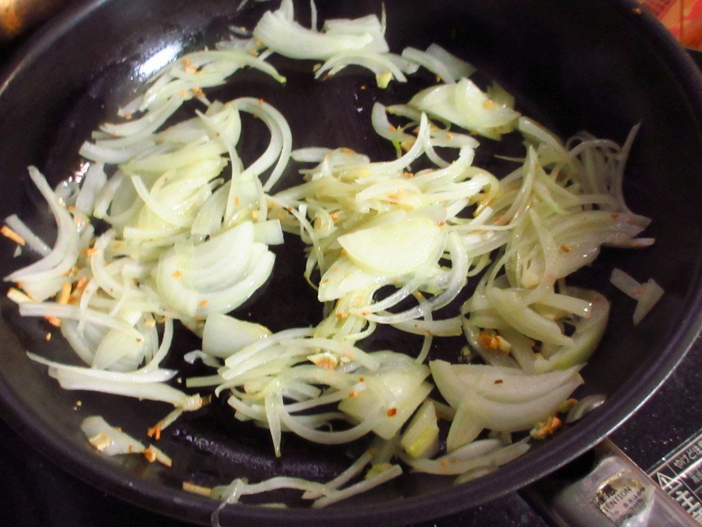 ②にんにく、たまねぎをみじん切りにし、油で炒めてひきにくを投入。