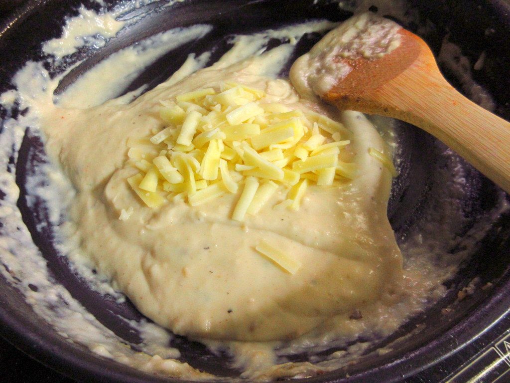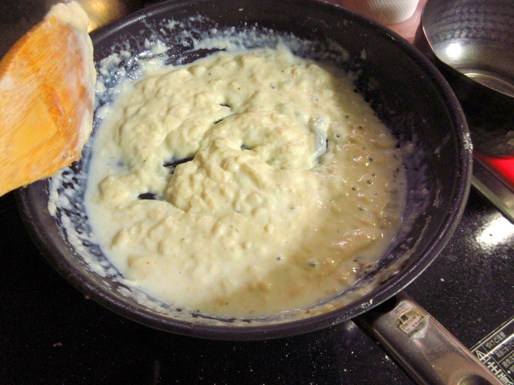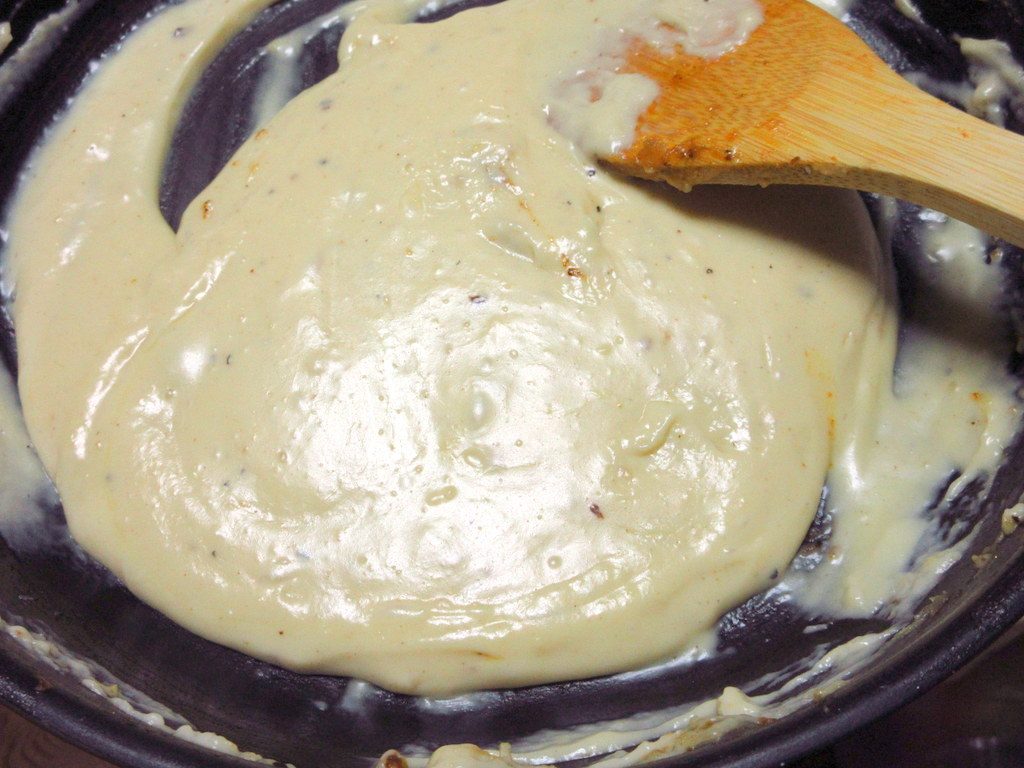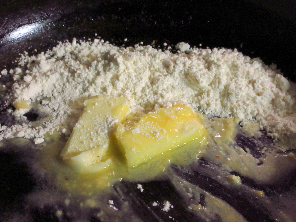バターで小麦粉を炒め、牛乳を少しずつ加え、そこにチーズを入れます。