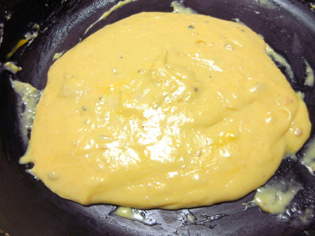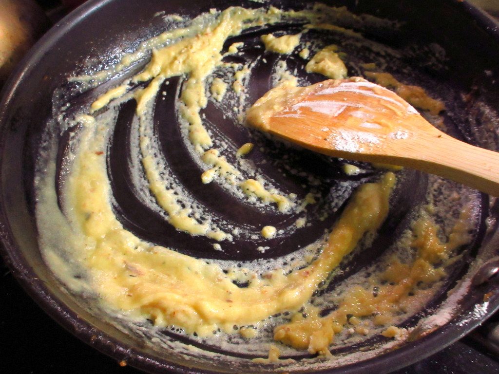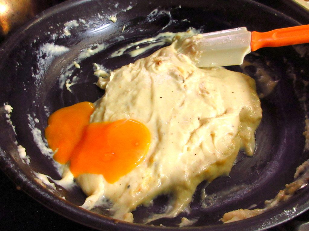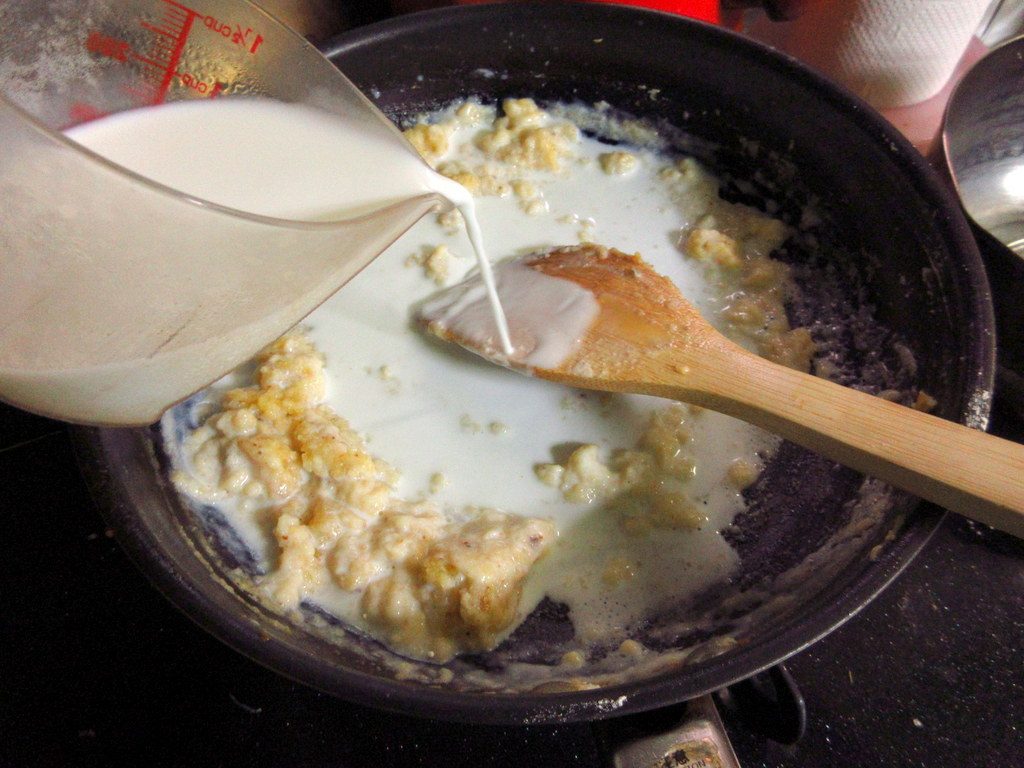バターで小麦粉を炒め、牛乳を少しずつ加え、そこにチーズを入れます。